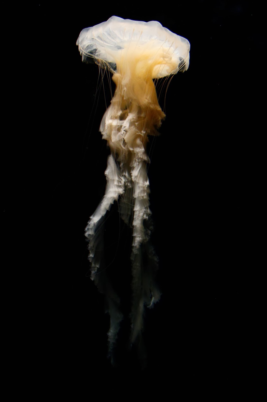 Down stairs The Jellies Experience continued, or maybe it was the beginning and I started at the end, either way, I encountered the incredible Indonesian Sea Nettle. This amazing jelly fish can grow tentacles ten feet long, spiraling gracefully out of a bell three feet in diameter. Their long flowing veil like tentacles awesomely illuminated by the tanks lighting. Golden and Platinum specters drifting in a black abyss, the room dark except for the light reflecting off the beautiful silhouettes. I sat and watched in a trance as they graceful pulsated around the tank, their long tentacles fantastically detailed, a complexity of simplicity.